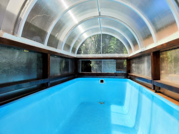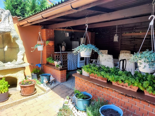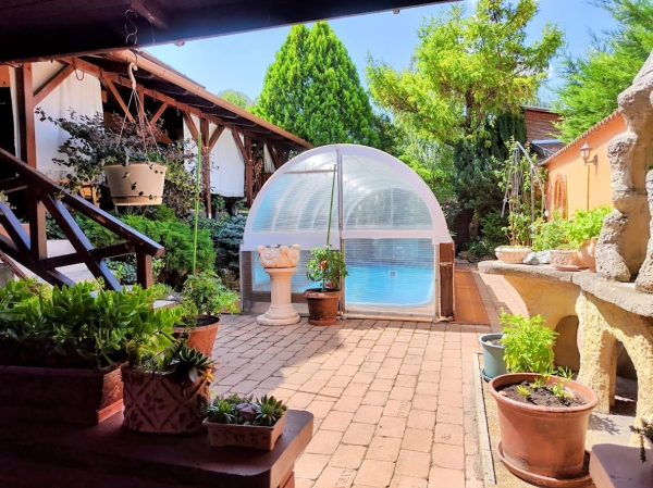 Úszómedencés, térkövezett sziklakertes, kevés további gondozást nem igénylő parkosított udvar, fedett terasz, nyári konyha.