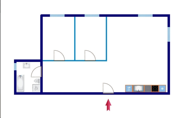 A lakásban egy nagy nappali amerikai konyhával és két hálószoba található.